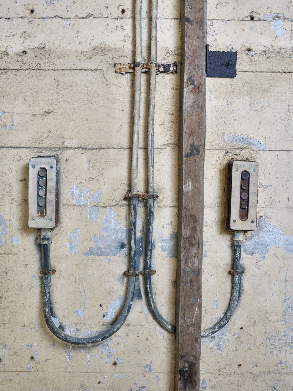 Vue des commandes électriques des portes blindées de protection A et B. On peut lire : Porte blindée (A), Porte blindée (B), O[uvertu]re, F[ermetu]re, A[r]ret, plus basImmatriculation