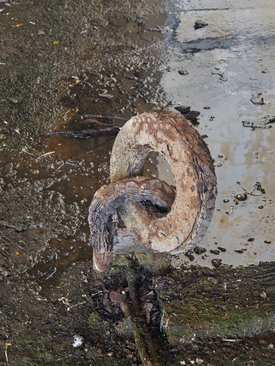Vue de l'un des deux organeaux situés de part et d'autre du quai permettant vraisemblablement de manoeuvrer le bateau-porte avec trois autres organeaux fixés au plafond (hypothèse)Immatriculation