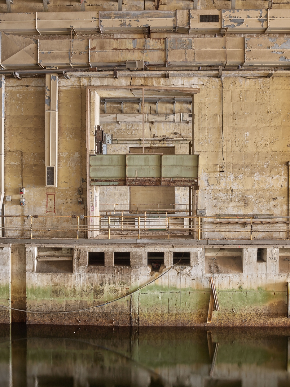 Vue du mur de refend entre les alvéoles A et B. Il est rythmé par de grandes ouvertures abritant des tableaux électriques. Sur le mur : le système de chauffage et ventilation. En dessous du niveau du quai, les passages des fluidesImmatriculation