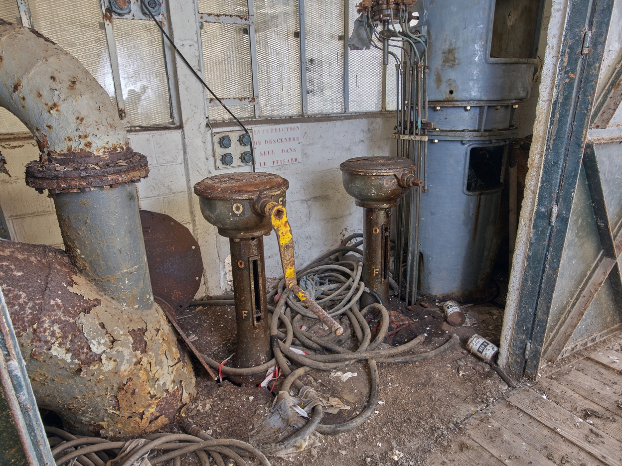 Vue du local des pompes sud situé entre les alvéoles A et B : commandes de pompe (dans cet espace, il faut imaginer la forte odeur de graisse mécanique). Elles fonctionnaient avec une manivelle. Sur le mur : consigne de sécurité concernant le puisardImmatriculation