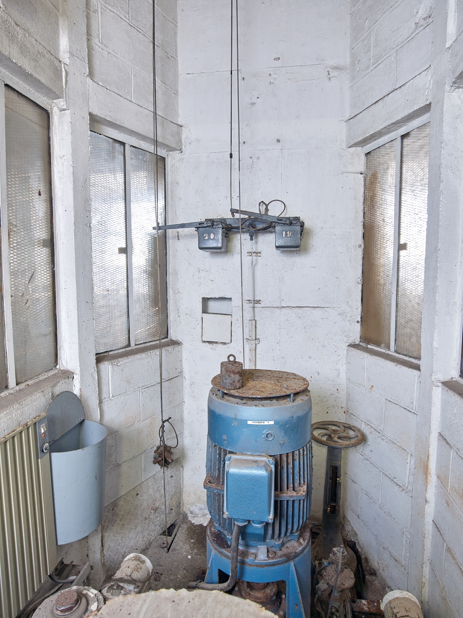 Vue du local des pompes nord situé entre les alvéoles A et B : pompe 1. Sur le mur, double interrupteur à flotteur avec contrepoidsImmatriculation