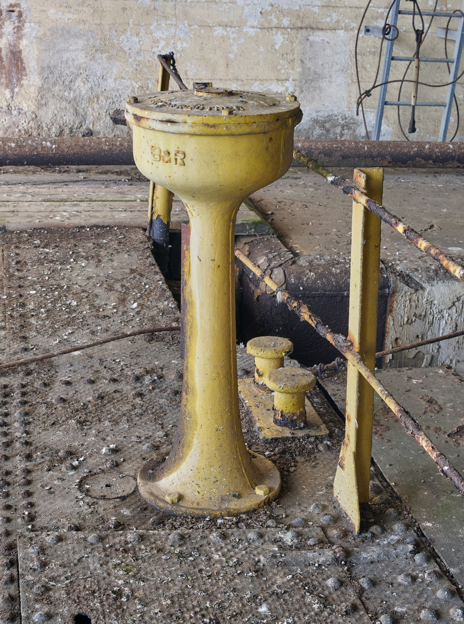 Vue de l'une des deux commandes de pompe sur le bateau-porte fermant le bassin. On peut lire : B et R pour Bopp et Reuther. Elle fonctionnait avec une manivelleImmatriculation