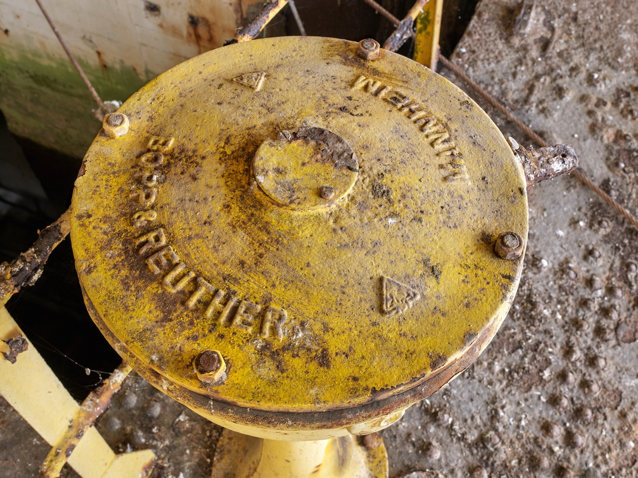 Vue de l'une des deux commandes de pompe sur le bateau-porte fermant le bassin. On peut lire : BOPP et REUTHER VANNHEIM. Elle fonctionnait avec une manivelleImmatriculation
