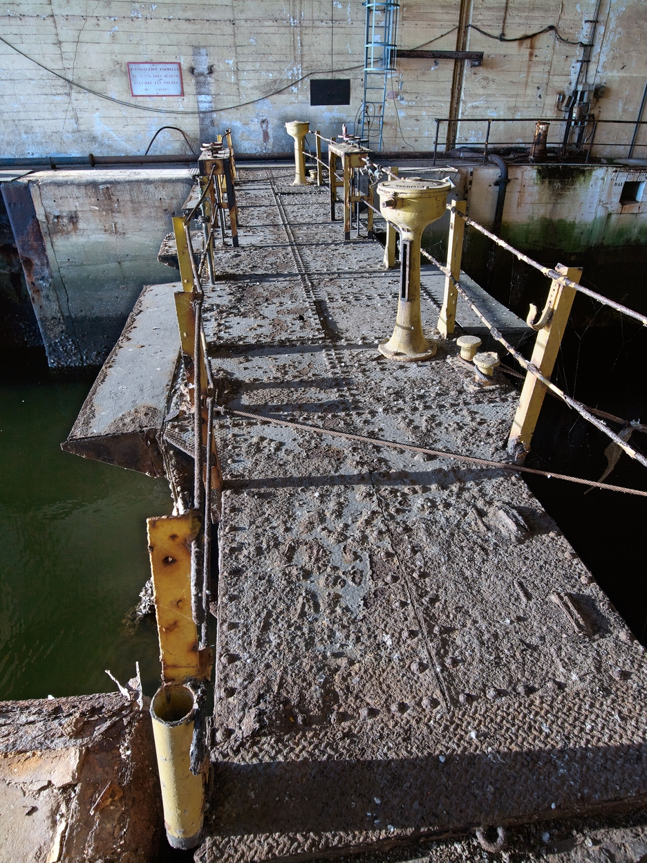 Vue du bateau-porte fermant le bassin avec ses commandes de pompes et vannes de ballastImmatriculation