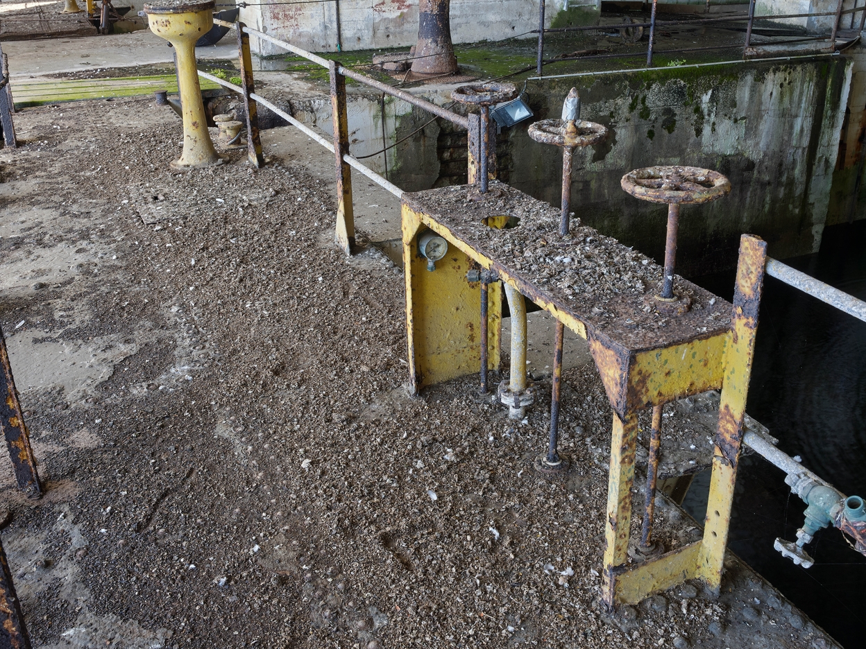 Vue des commandes des vannes de ballast du bateau-porte fermant le bassin (vers l'intérieur)Immatriculation