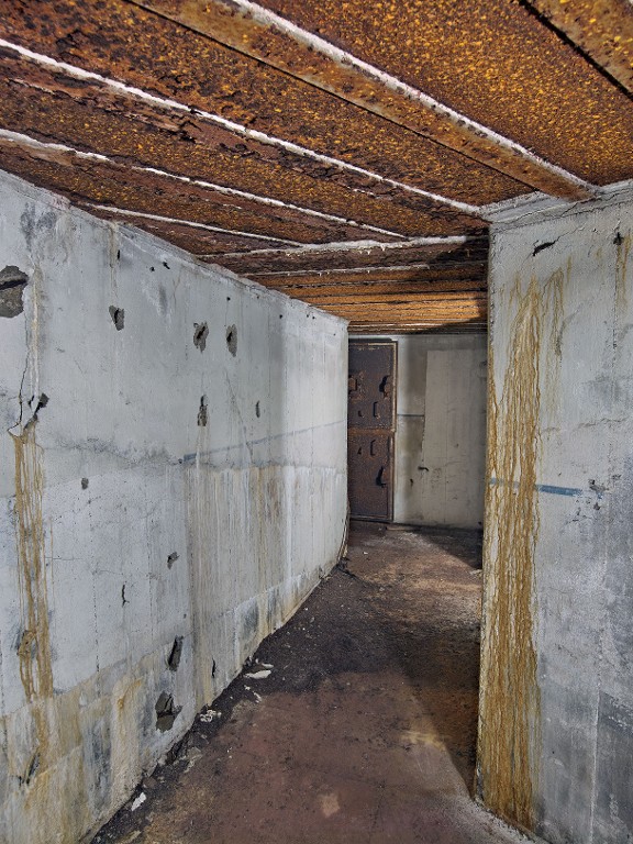 Vue du couloir d'accès au logement des soldats et à la chambre de combat sud-ouest. La peinture des murs, avec liseré, est d'origineImmatriculation