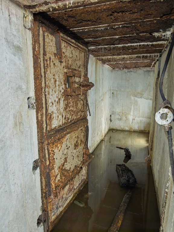 Vue du couloir d'accès de la chambre de combat nord-ouest : porte blindée à deux vantaux. La chambre de combat nord-ouest est partiellement inondéeImmatriculation