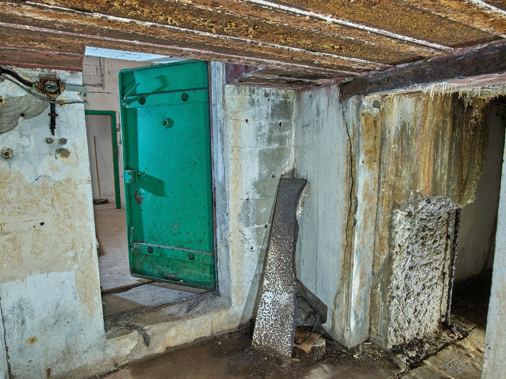 Vue du vestibule avec sa porte étanche. A droite, le mur en béton est élargi afin de permettre un passage plus aiséImmatriculation