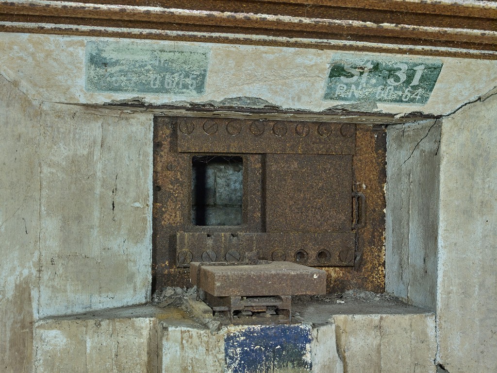 Vue de la chambre de combat nord : support d'affût de la mitrailleuse et créneau blindé ; au-dessus, deux cartouches avec marquage. Le volet blindé est déposé. L'embrasure est muréeImmatriculation