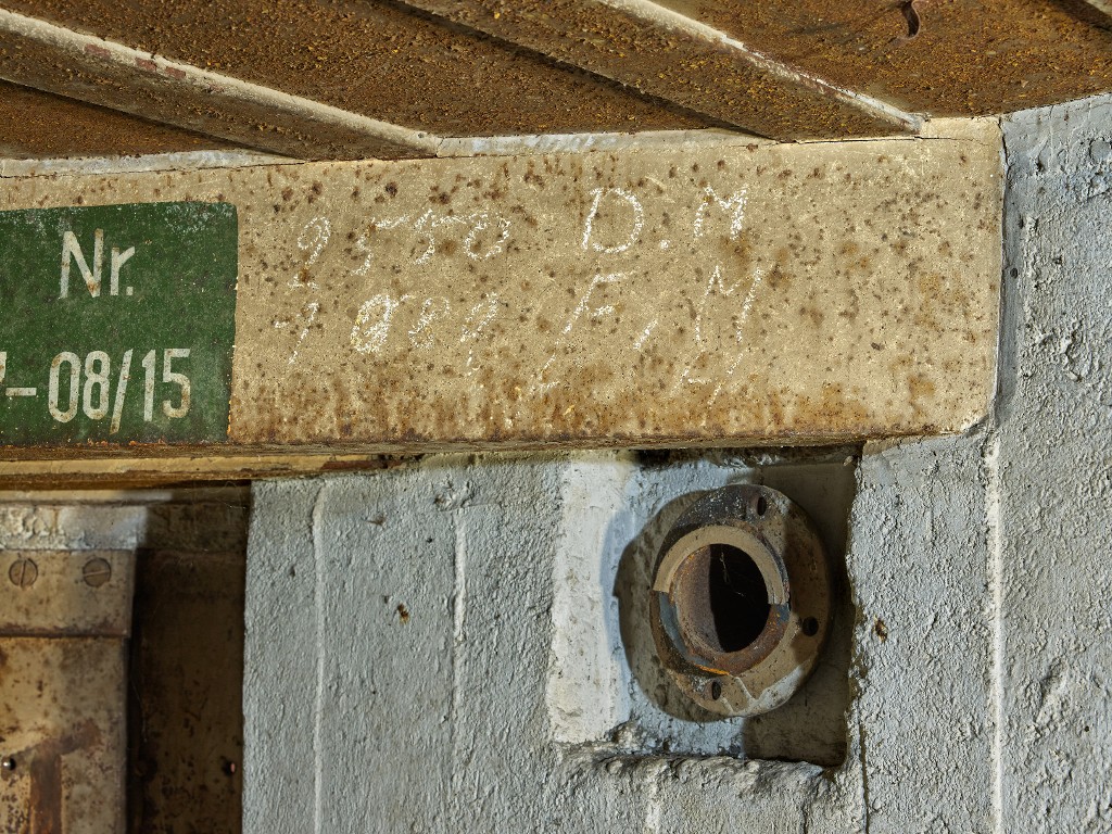 Vue de la chambre de combat : linteau du poste de tir et tuyau du système de ventilation (le clapet de surpression a disparu). On peut lire l'inscription écrite à la craie : 2550 D.M ; 1080 F.MImmatriculation