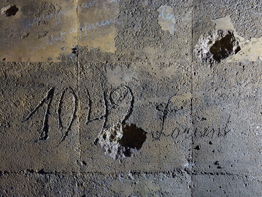 Vue de l'extension nord-ouest : détail du mur nord-ouest du bunker KIII depuis le troisième étage : sculpture sur béton en cours de prise, 1942 Lorient et inscription à la craie plus récente. Des traces d'impact de tir sont également visiblesImmatriculation