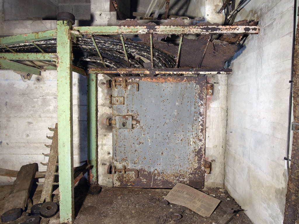 Vue du sous-sol de la centrale électrique : extrémité est, chemin de câble électrique. La porte blindée donne sur la galerie technique souterraine qui dessert les bunkers KI, KII et KIIIImmatriculation