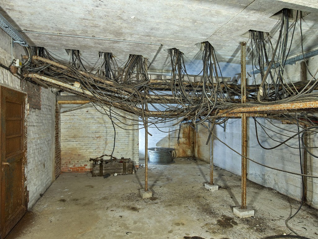 Vue du sous-sol de la centrale électrique : chemin de câble électrique alimentant la salle de commande située au rez-de-chaussée. Les murs de refend sont en briqueImmatriculation