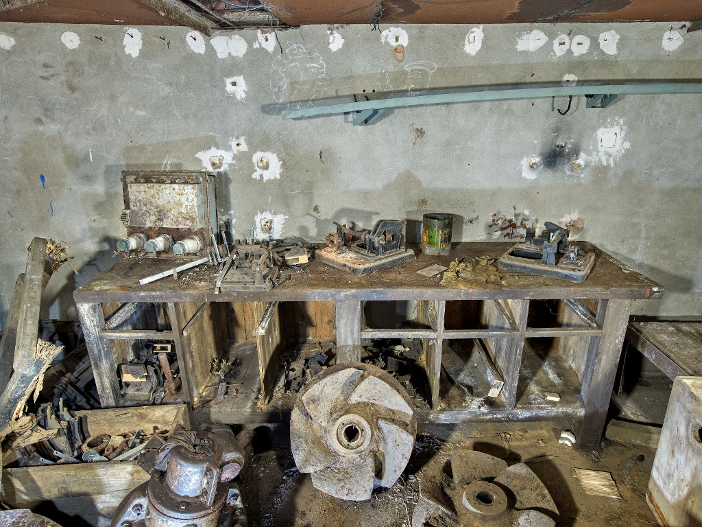 Vue du sous-sol de la centrale électrique : atelier de réparation et magasin de stockage, établi en bois et pièces diversesImmatriculation