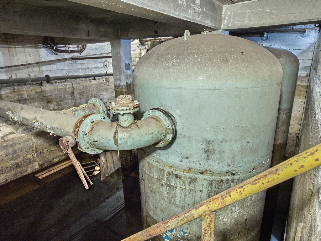 Vue du sous-sol de la salle des groupes électrogènes diesel : extrémité est, deuxième sous-sol, ensemble de deux grands réservoirsImmatriculation