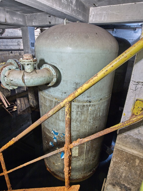 Vue du sous-sol de la salle des groupes électrogènes diesel : extrémité est, deuxième sous-sol, ensemble de deux grands réservoirsImmatriculation