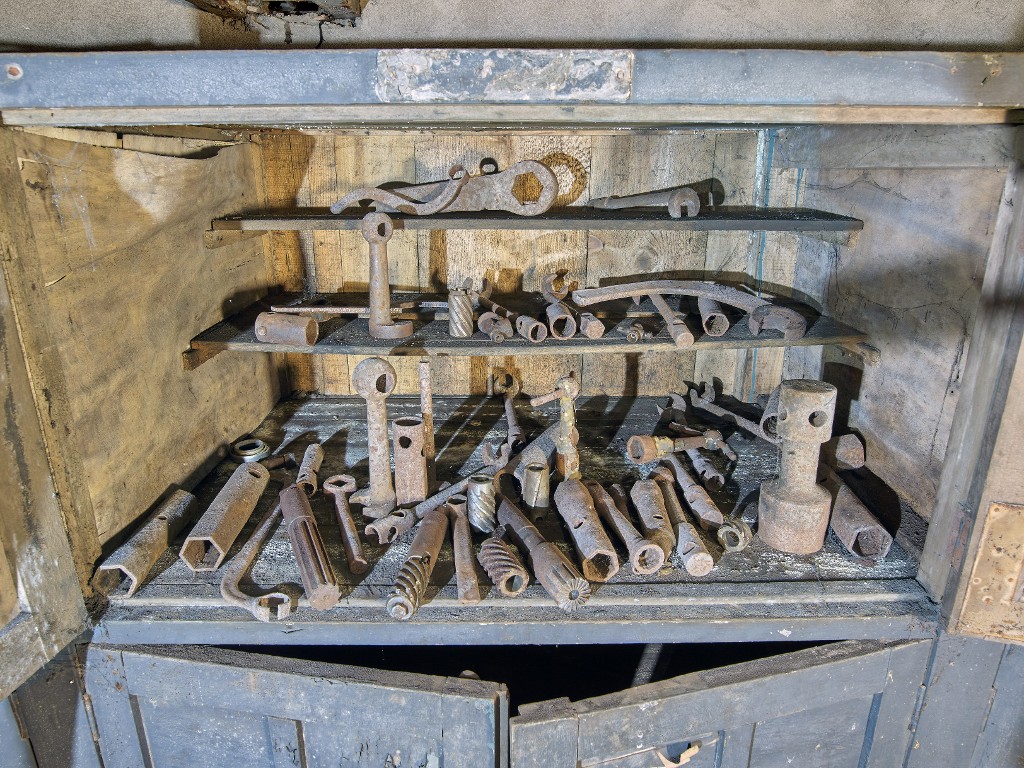 Vue du sous-sol de la salle des groupes électrogènes diesel : extrémité ouest, intérieur de l'une des armoires d'atelier avec ses outils et accessoires pour machine-outilImmatriculation