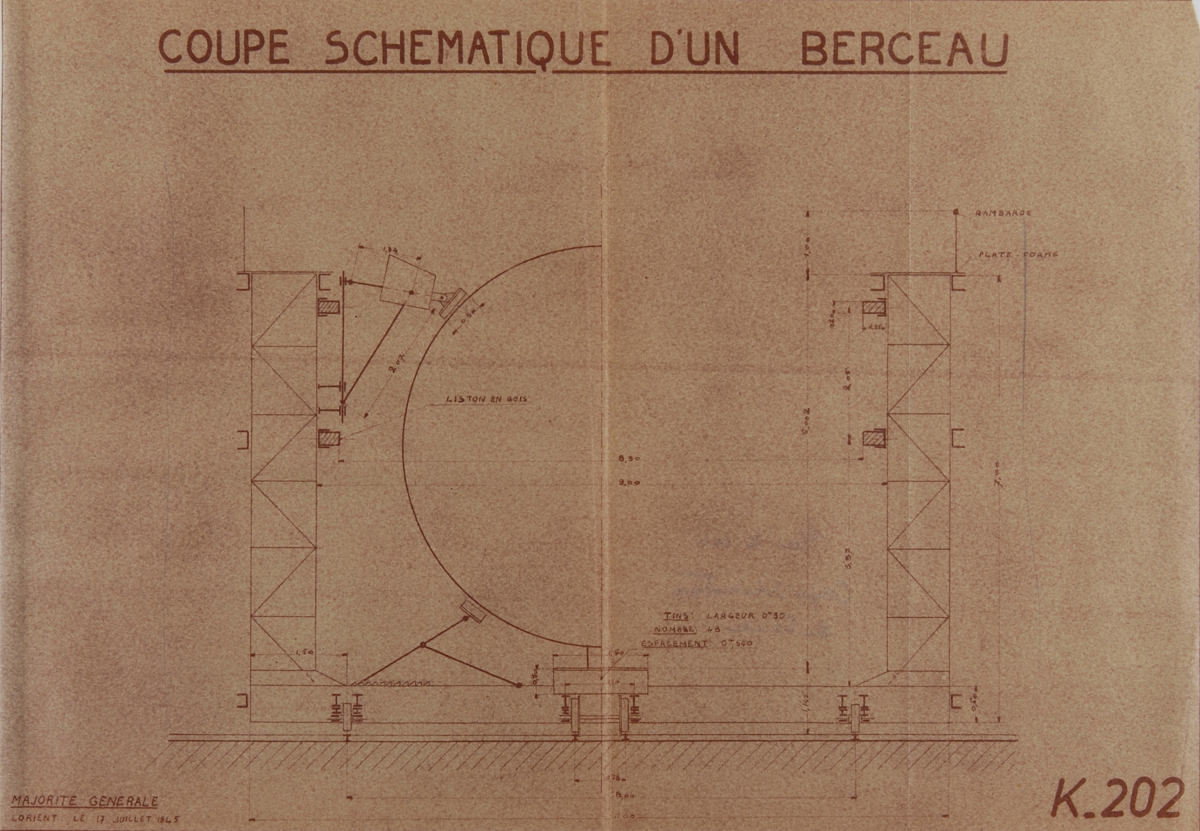 Coupe schématique du berceau du slipway, plan K n° 202, 17 juillet 1945 (Service Historique de la Défense de Lorient, Monographie de la base "Ingénieur Général Stosskopf", 1945-1946)Immatriculation
