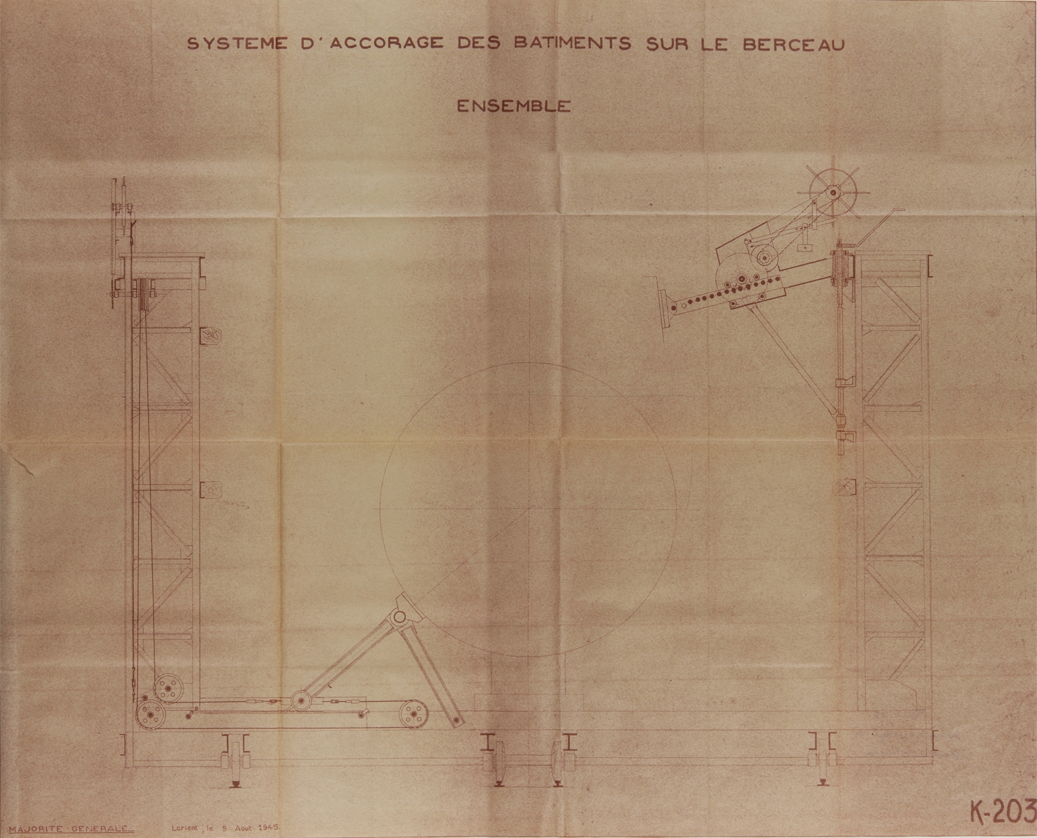 Coupe du berceau du slipway et du système d'accorage, plan K n° 203, 9 août 1945 (Service Historique de la Défense de Lorient, Monographie de la base "Ingénieur Général Stosskopf", 1945-1946)Immatriculation