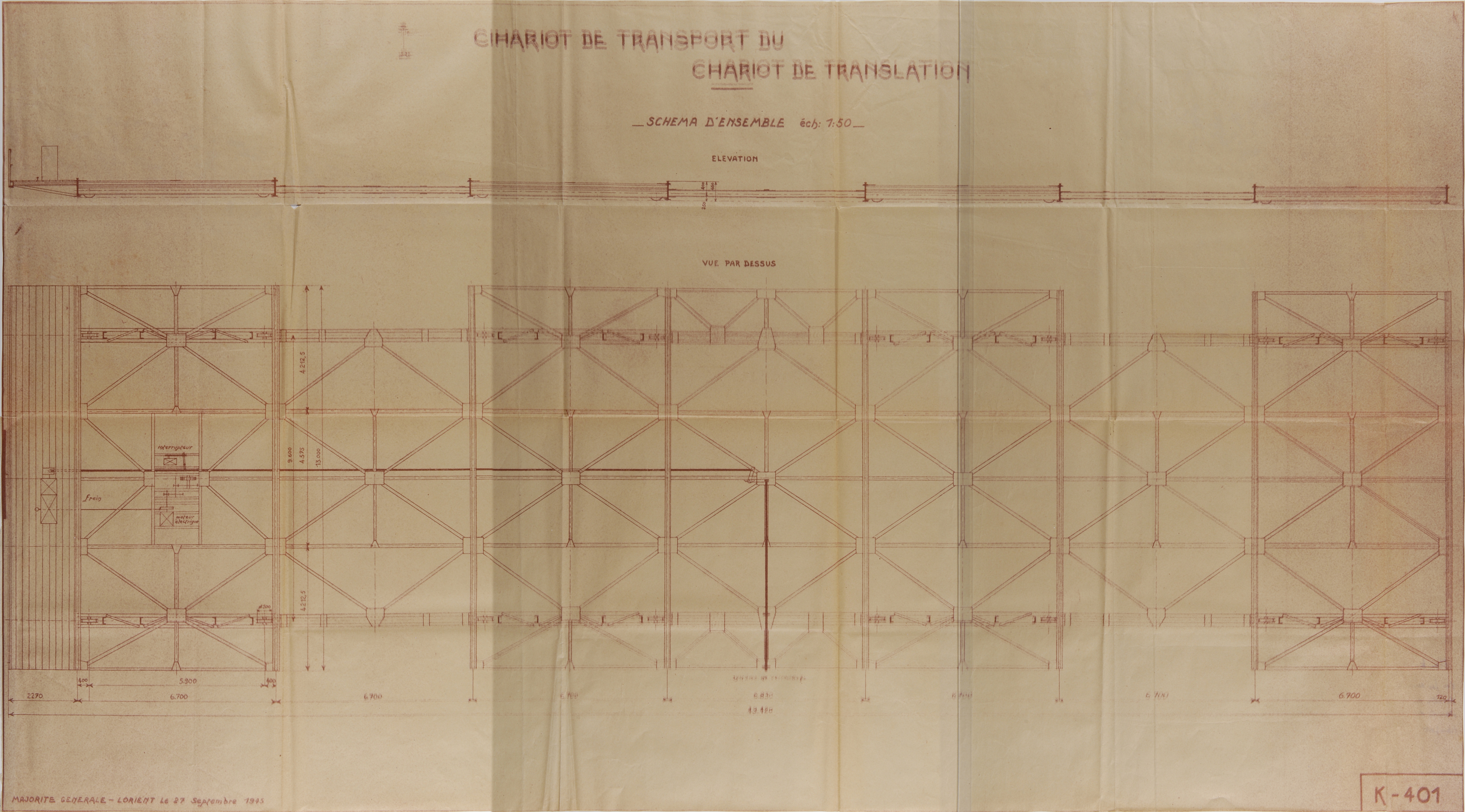 Elévations du chariot de transport du chariot de translation, plan K n° 401, 27 septembre 1945 (Service Historique de la Défense de Lorient, Monographie de la base "Ingénieur Général Stosskopf", 1945-1946)Immatriculation