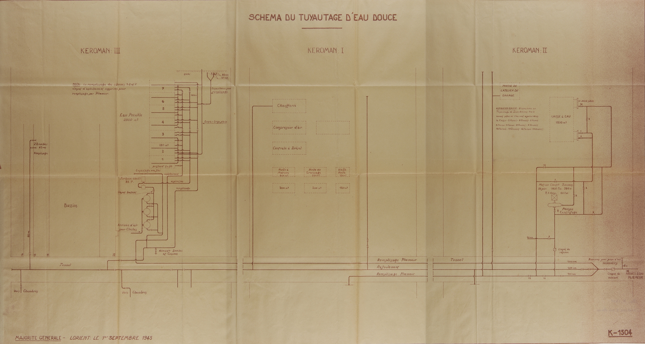 Schéma du tuyautage d'eau douce de Keroman, plan K n° 1504, 1er septembre 1945 (Service Historique de la Défense de Lorient, Monographie de la base "Ingénieur Général Stosskopf", 1945-1946)Immatriculation