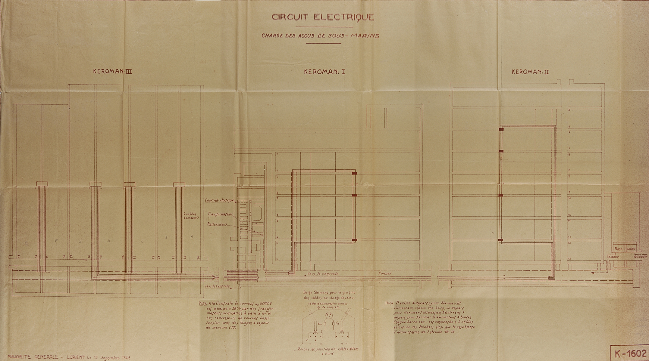 Plan du circuit électrique de Keroman : charge des accumulateurs de sous-marins, plan K n° 1602, 15 septembre 1945 (Service Historique de la Défense de Lorient, Monographie de la base "Ingénieur Général Stosskopf", 1945-1946)Immatriculation
