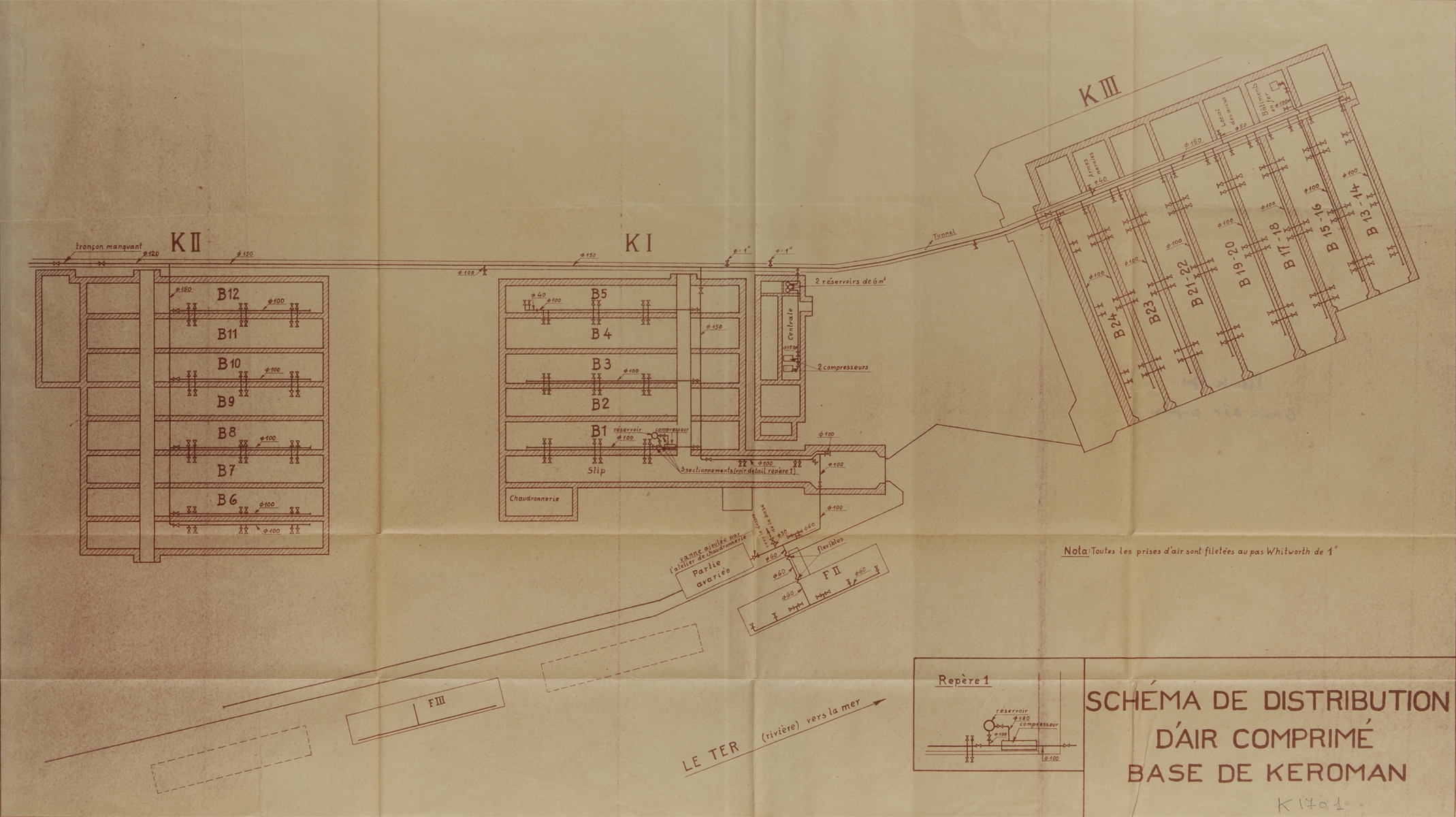 Schéma de distribution d'air comprimé de la base de Keroman, plan K n° 1701 (Service Historique de la Défense de Lorient, Monographie de la base "Ingénieur Général Stosskopf", 1945-1946)Immatriculation