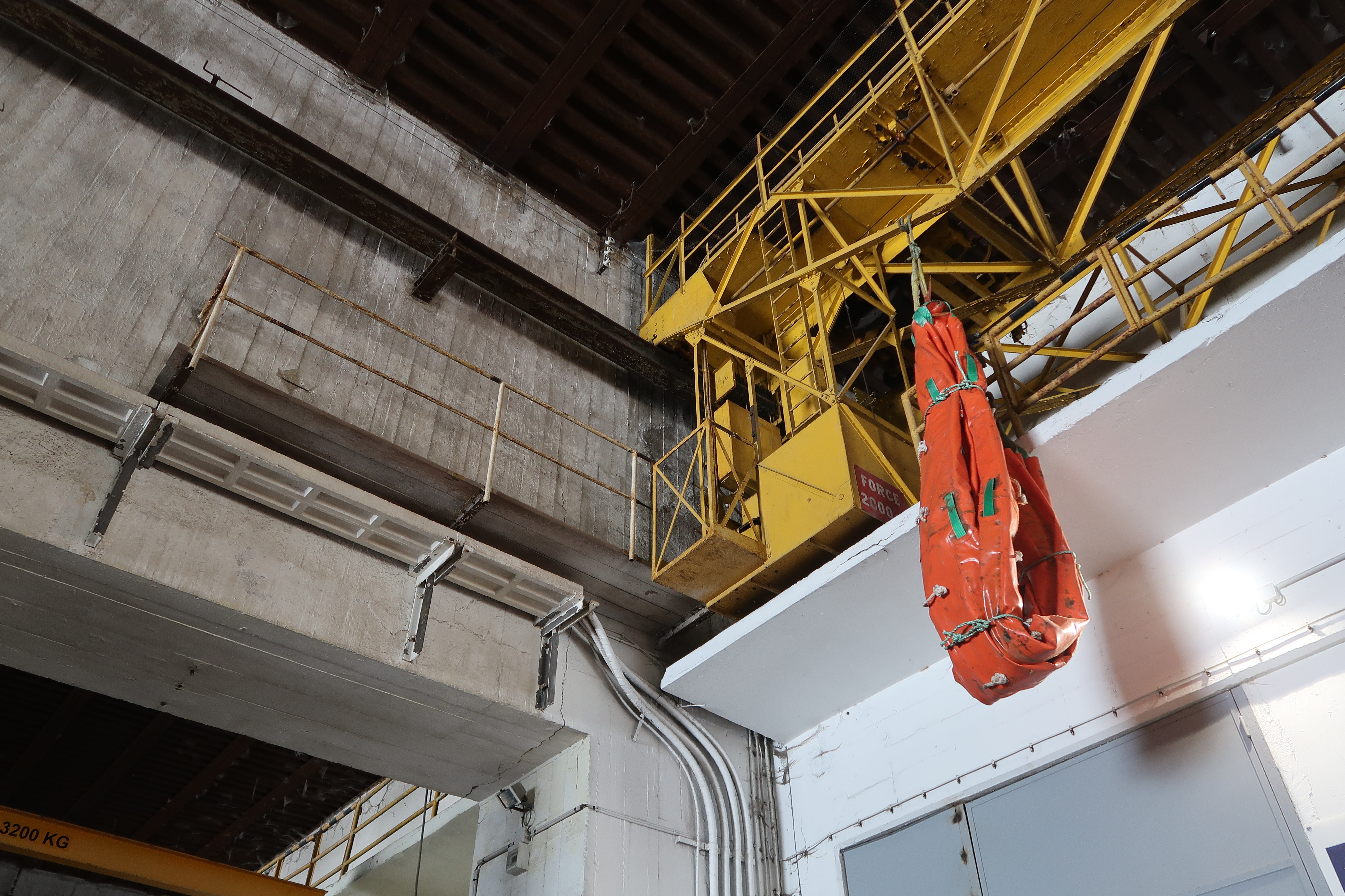 Vue du pont roulant Levman depuis l'alvéole sud (état en 2023). Il est arrêté au-dessus de l'avancée du premier étageImmatriculation