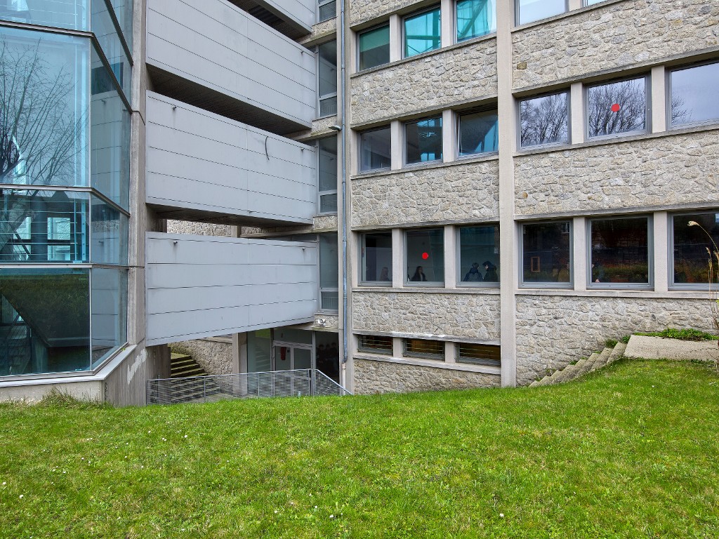 Détail de la façade ouest de l'internat. Jonction entre une cage d'escalier créée lors de la restructuration des années 2000 et le bâtiment d'origine.Immatriculation