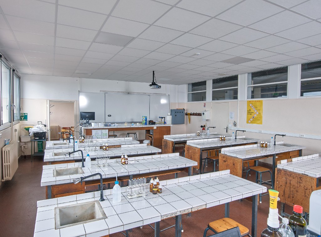 Salle de sciences avec estrade et mobilier spécifique en métal, bois et faïence. La robinetterie semble ne pas être d'origine.Immatriculation