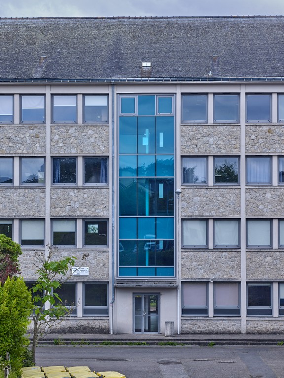 Externat, façade ouest. Détail sur une cage d'escalier réhabilitée. Noter également l'organisation de la trame, avec un poteau porteur toutes les deux trames de 1,75m.Immatriculation
