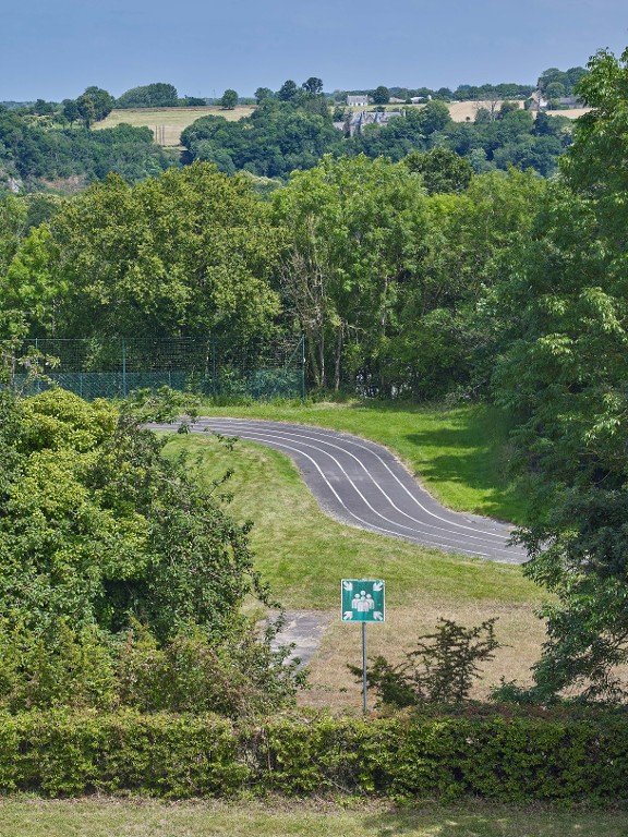 Vue prise de l'internat garçon, vers l'est, sur la piste d'athlétisme, la vallée de l'Argentel et la commune de Taden.Immatriculation