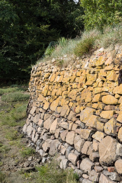 Vue du parement de la cale en pierre sèche avec un fruit prononcé, sur la rive ouest du JaudyImmatriculation