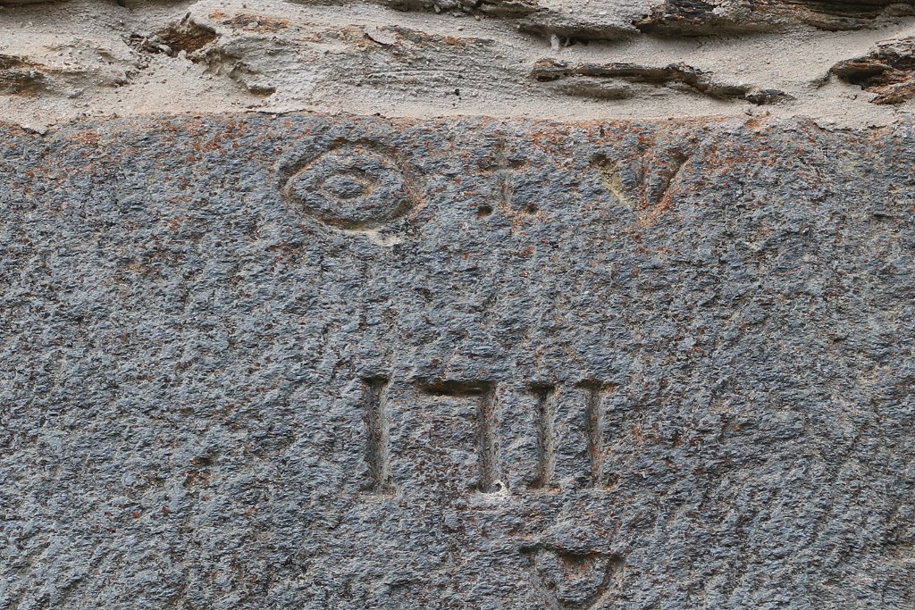 L'Ile Verte. Maison de tisserand. Détail du linteau daté 1711, orné d'une navette de tisserand styliséeImmatriculation