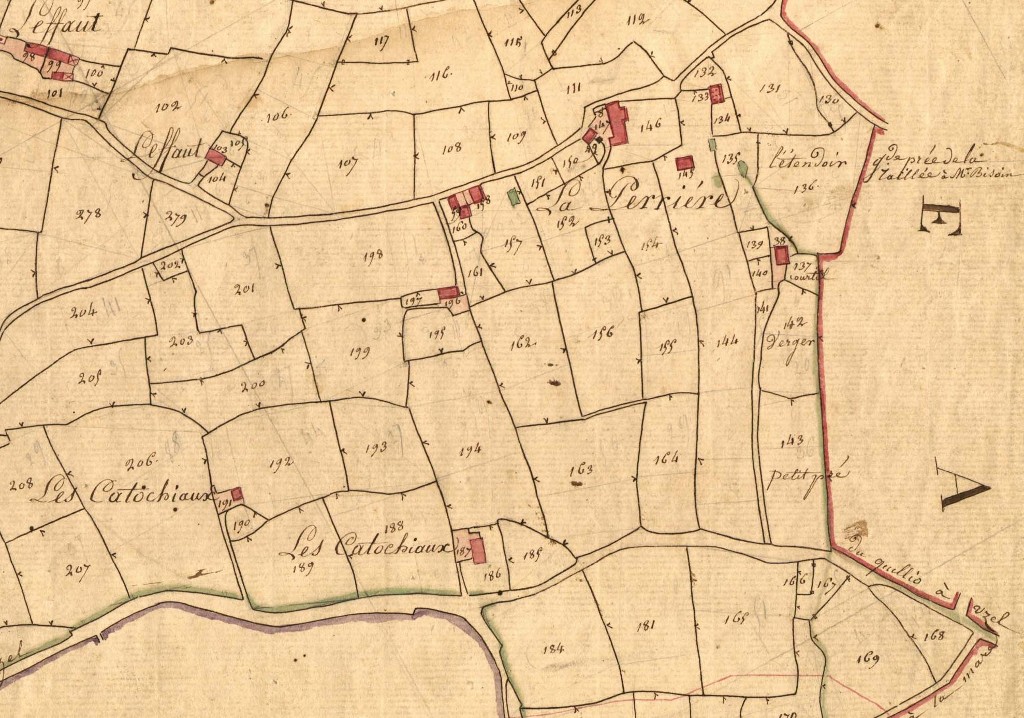 Les Catochiaux et La Perrière en 1828. Extrait du cadastre ancien, section B1 (Archives départementales des Côtes-d'Armor, série 3 P 265)Immatriculation