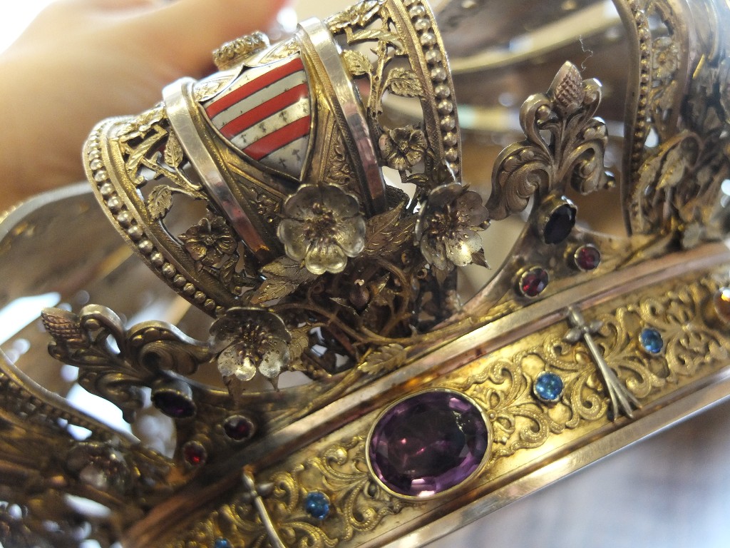 Détail de la couronne du couronnement de Notre-Dame de Rostrenen, ornée de pierres semi-précieuses, métal doré, face avec le blason de RostrenenImmatriculation