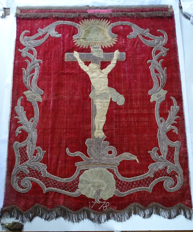 Bannière : sainte Agnès, Crucifixion, église paroissiale Sainte-Agnès (Tréfumel),