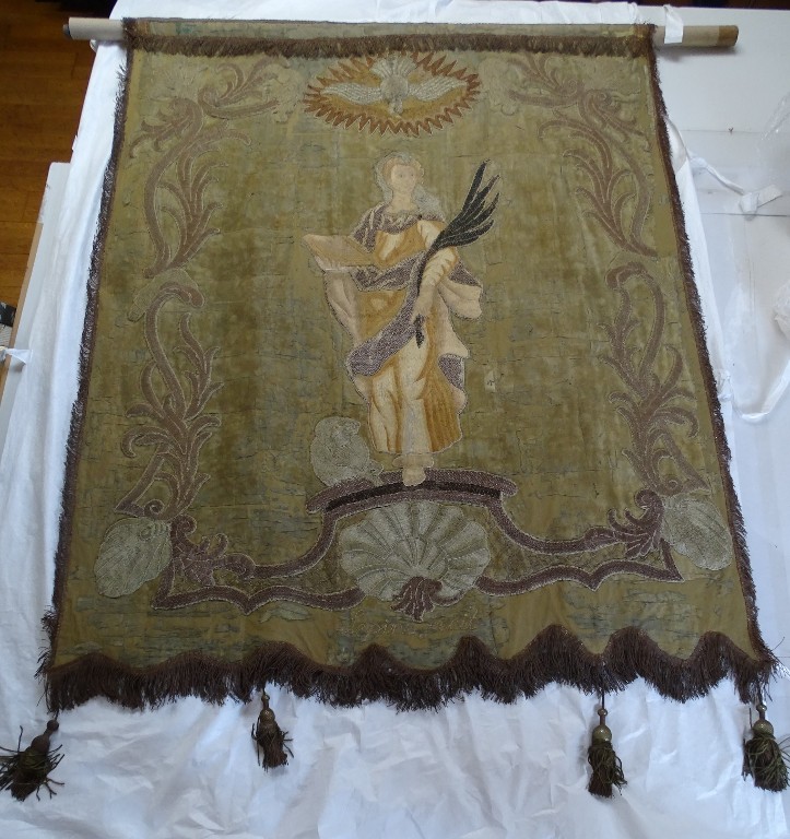 Bannière : sainte Agnès, Crucifixion, église paroissiale Sainte-Agnès (Tréfumel),