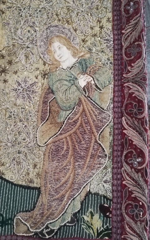 Bannière : saint évêque, Crucifixion, église Saint-Maudez (Coatascorn),