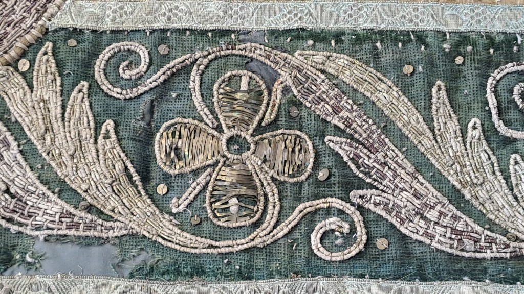 Détail : Bordure brodée sur velours - face saint MaudezImmatriculation