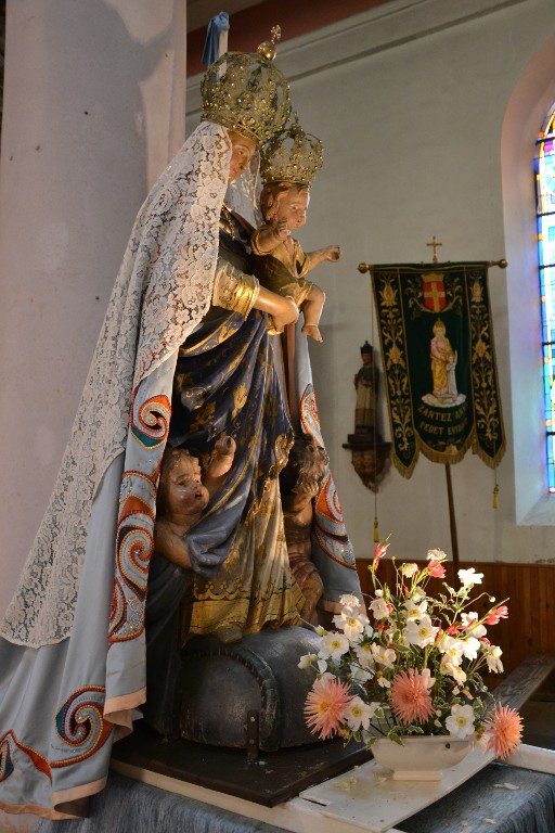 Vierge à l'enfant dite Notre-Dame des Fontaines, sur son brancard de procession, couronnes dorées, voile en dentelle, robe bleu, puttis et demi-sphère bleuImmatriculation