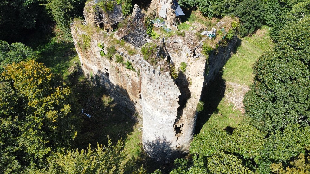 Vue aérienne oblique depuis l'est. Au premier plan, la tour orientale. Le château est couronné de consoles de mâchicoulisImmatriculation