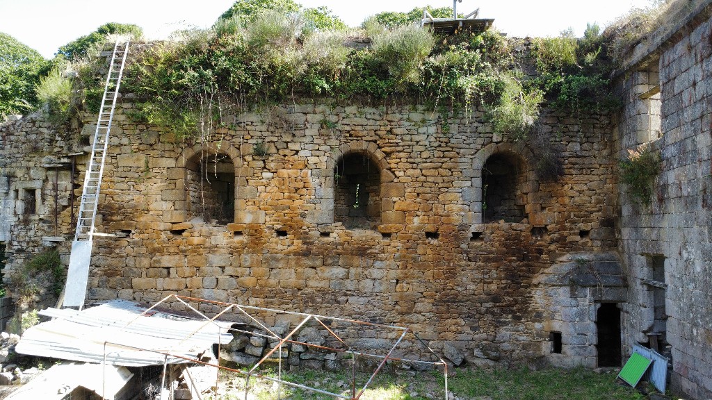 Vue aérienne : courtine nord-est. Elle est percée au premier étage d'une série de trois archères-canonnières (longue mire verticale et orifice circulaire). Leur accès se faisait par une galerie en charpente faisant chemin de ronde. A droite, le logisImmatriculation