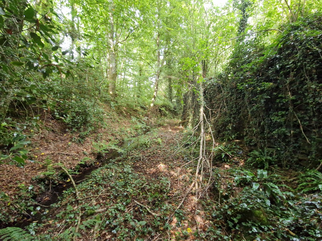Vue du fossé à l'ouest. Un ruisselet y coule. Sous la végétation à droite, l'enceinte maçonnéeImmatriculation