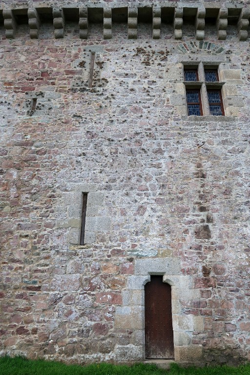 Vue de l'élévation postérieure côté Trieux : détail de la poterne et du premier étage avec une baie à croisée de pierre. Les grands jours verticaux éclairent l'escalier en vis sud. Au sommet, les consoles à trois ressauts supportant le mâchicoulisImmatriculation