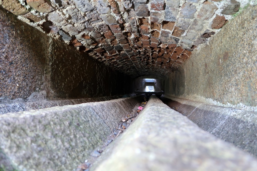 Vue du couloir de chauffe voûté en brique réfractaire (état en 2024). Le plan incliné est doté de trois rainures en granite ; les parois latérales sont en graniteImmatriculation