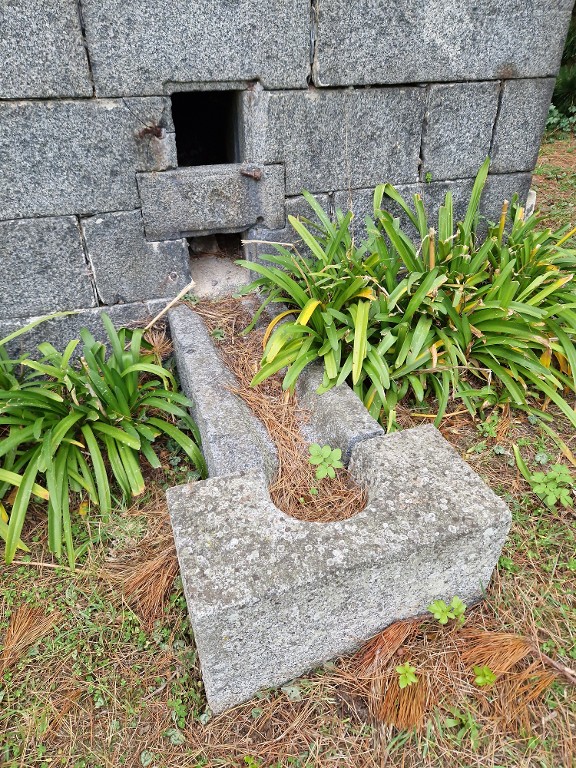 Vue de détail de l'élévation ouest en pierre de taille de granite (état en 2024). La goulotte de réception des boulets rouges est en graniteImmatriculation