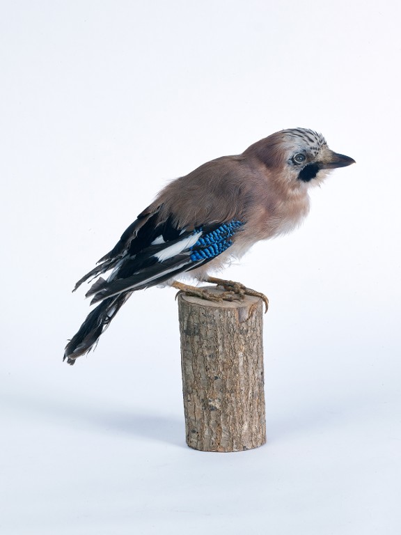 Geai naturalisé fixé sur branche, réalisé par Mme Vila ( Brest), acquis en 1962.Immatriculation