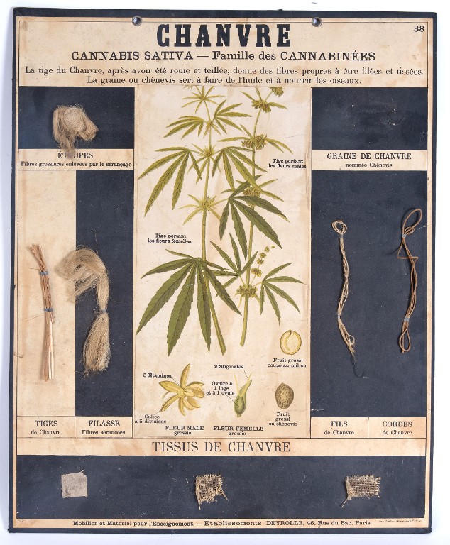 Planche pédagogique sur les utilisations alimentaires et textiles du chanvre avec échantillons fixés (les graines sont manquantes), maison Deyrolle non daté.Immatriculation