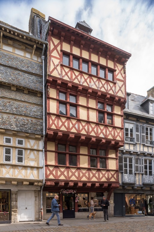 Ensemble de la façade à gouttereau sur rue de cette imposante maison, dont les trois étages sont en encorbellement sur solives et entretoises.Immatriculation